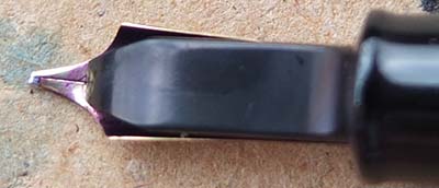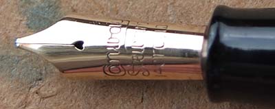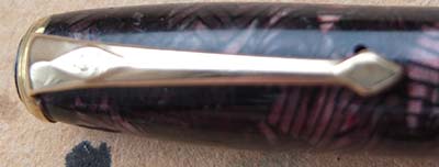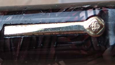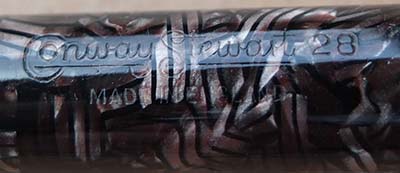 Here is a nice condition CS28 in burgundy hatch, made around 1950; the pen is a lever-filler and has a medium grade 14ct gold nib and writes nicely; there is no plating wear on the band or the clip but just a little pitting and some wear on the lever; there are no cracks, chips or deep scratches and the imprint is readable; the whole pen has faded just a little from its original colour.