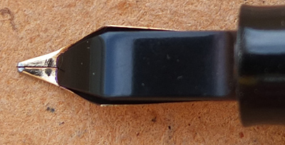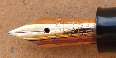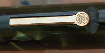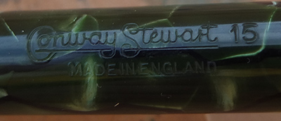 Here is a very nice condition CS15 in greenh and black, made around 1950; the pen is a lever-filler and has a medium grade 14ct gold nib and writes nicely; there is little or no plating wear on the band, the clip or the lever; there are no cracks, chips or deep scratches and the imprint is crisp.