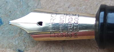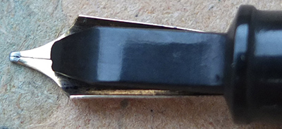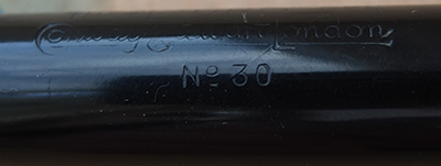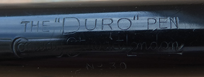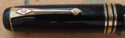 Here is a nice condition CS30 fountain pen in black, made around 1937; the pen is a button-filler and has a medium grade 14ct gold Duro nib and writes nicely; there is little or no plating wear on the clip or the bands; there are no cracks, chips or deep scratches and the imprint is very readable; please don't call me telling me CS30s should have a two-band cap as this is one of the later versions with three bands.