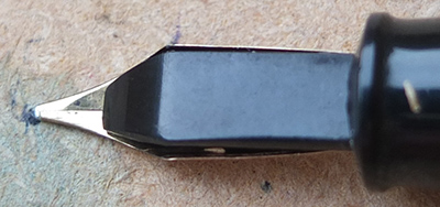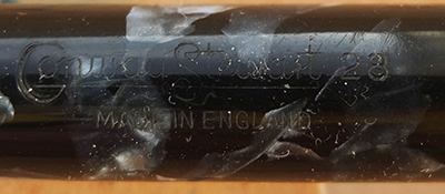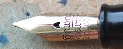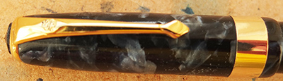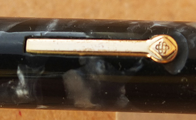 Here is a very nice condition CS27 in blue and black marbled finish, made around 1950; the pen is a lever-filler and has a medium to broad grade 14ct gold nib and writes nicely; there is no plating wear on the band, the clip or the lever; there are no cracks, chips or deep scratches and the imprint is crisp. Please note this pen has had a new clip fitted.