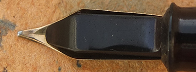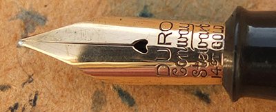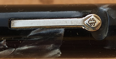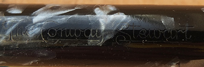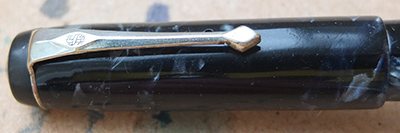 Here is a nice condition CS The Conway Stewart in blue and black marbled finish with nickel plated trim, made around 1940; the pen is a lever-filler and has a medium grade 14ct gold Duro nib and writes nicely; there is no plating wear on the clip or the lever; there are no cracks, chips or deep scratches and the imprint is readable.