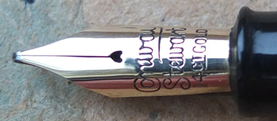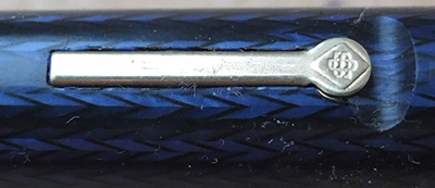 Here is a nice condition CS85L fountain pen in blue herringbone, made around 1955; the pen is a lever-filler and has a medium grade 14ct gold nib and writes nicely; there is no plating wear on the clip and the lever, but there is a little on the edges of the band; there are no cracks, chips or deep scratches and the imprint is readable; this is a nice pen, big too.