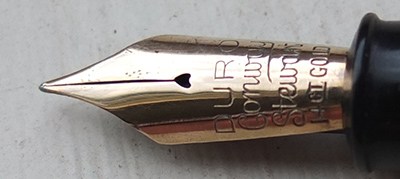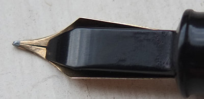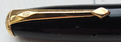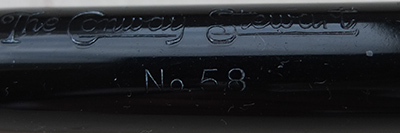 Here is a very nice condition CS58 fountain pen in black, made around 1950; the pen is a lever-filler and has a fine grade 14ct gold slightly flexible nib; it writes nicely; there is no plating wear on the bands and none on the clip, but there is a little plating wear and a little pitting on the lever; there are no cracks, chips or deep scratches and the imprint is readable; this is a nice pen. This pen has had a new clip fitted.
