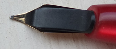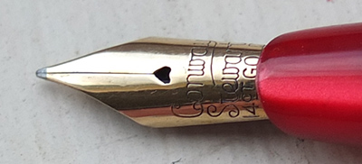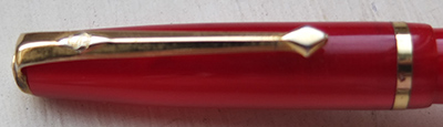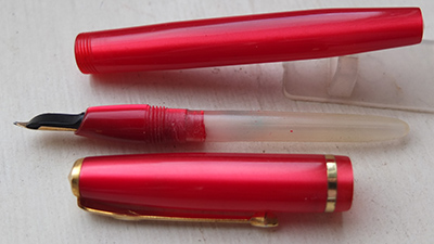 Here is a very nice condition, almost mint, CS Dinkie in red, made around 1970; the pen is a squeezy-filler and has a medium grade 14ct gold nib and writes nicely; there is no plating wear on the clip or the band; there are no cracks, chips or scratches. A lovely little pen.