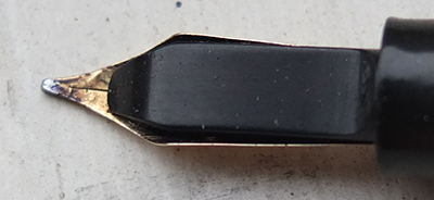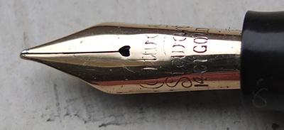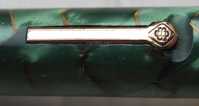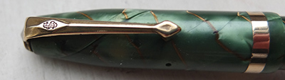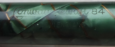 Here is a very nice condition CS84, made around 1950, in green and gold with goldd-filled trim; the pen is a lever-filler and has a medium grade 14ct gold nib and writes nicely; there is little or no plating wear on the band, the clip or the lever; there are no cracks, chips or deep scratches and the imprint is crisp.