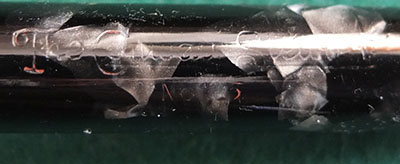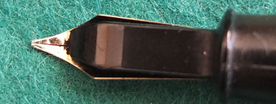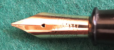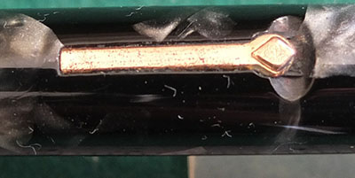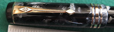 Here is a nice condition CS55 in blue and black marbled finish with gold plated trim, made around 1940; the pen is a lever-filler and has a medium grade 14ct gold Duro nib and writes nicely; there is little or no plating wear on the clip or the band but the lever is a little pitted and losing some plating on its edges; there are no cracks, chips or deep scratches and the imprint is readable.