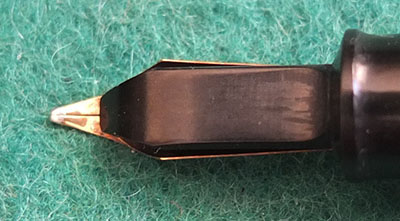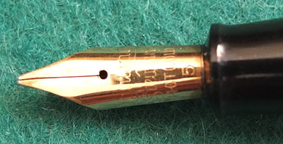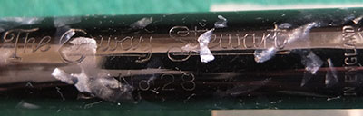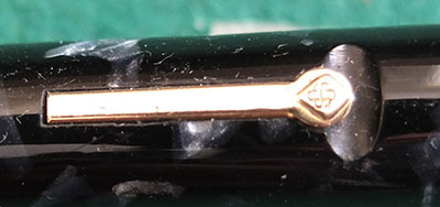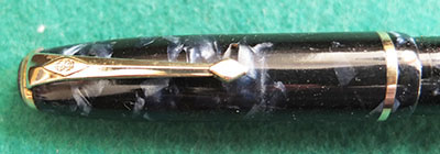 Here is a very nice condition CS28 in blue and black marbled finish, made around 1950; the pen is a lever-filler and has a medium grade 14ct gold nib and writes nicely; there is no plating wear on the band, the clip or the lever; there are no cracks, chips or deep scratches and the imprint is readable.
