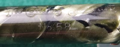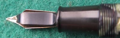 Here is a very nice condition CS58 in green and black marbled finish, made around 1950; the pen is a lever-filler and has a medium grade 14ct gold nib and writes nicely; there is no plating wear on the bands but the clip has just a little on the high points whilst there is just a little pitting on the edges of the lever; there are no cracks, chips or deep scratches and the imprint is readable.