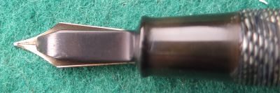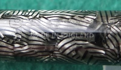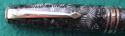 Here is a very nice condition CS58 in green and black lined finish, made around 1950; the pen is a lever-filler and has a medium grade 14ct gold nib and writes nicely; there is no plating wear on the bands but the clip has just a little on the high points whilst there is just a little pitting on the edges of the lever; there are no cracks, chips or deep scratches and the imprint is readable.