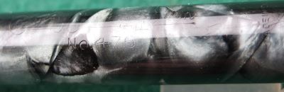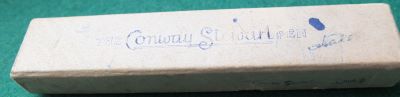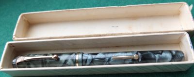Here is a very nice condition CS476 in blue and black marble, made around 1940; the pen is a lever-filler and has a fine grade 14ct gold nib and writes nicely; there is a little plating wear on the band, the high points of the clip, and on the edges of the lever; there are no cracks, chips or deep scratches and the imprint is readable.