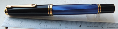 oeu281: A Pelikan M800 Souveran fountain pen in blue and black; the pen dates from 2015 and has NOT been used but has been inked; it is a piston-filler; the pen writes nicely and is in immaculate condition with a very broad italic grade 18ct gold nib. (nib marked IB) £425.00 |