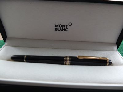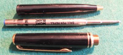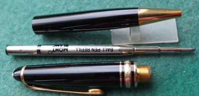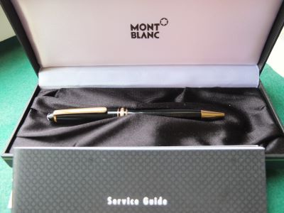 oeu294: A carefully used Mont Blanc ballpoint pen in black with gold-plated trim; this pen is in lovely condition but doesn't come with its box. It is genuine as are all the other MB pens on my site. £90.00 SOLD |
