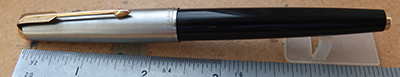 Here we have a very nice Parker 61 De-Luxe fountain pen in black with a brushed steel cap and gold-filled trim; the pen is from the mid 1960s and has been used but still has years of life left in it; there are no marks on the barrel or on the cap; the pen has a medium grade 14ct gold nib; the pen is a cartridge or converter-filler with a converter fitted. This pen writes nicely. It is boxed with its original leaflet.