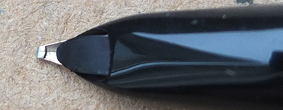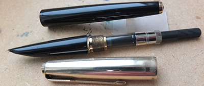 Here we have a very nice Parker 61 fountain pen in black with a gold-filled cap; the pen is from the mid 1960s and has been used but still has years of life left in it; there are no marks on the barrel or on the cap; the pen has a broad oblique grade 14ct gold nib; the pen is a cartridge or converter-filler with a converter fitted. This pen writes nicely.