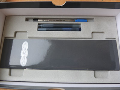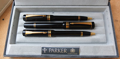 Here we have a very nice condition, almost mint, Parker International triple pen set in black and boxed too with outer box, booklet, and bits; the fountain pen is a cartridge or converter-fill, with a converter fitted, and a medium grade 18ct gold nib; the ballpen has a working refill with a spare in the box; the pencil has spare leads and a new eraser; this pen set has not been used much so is in such super condition; there are no cracks, splits or scratches and the clips are firm; the pen set is boxed and I would think it was the original.
