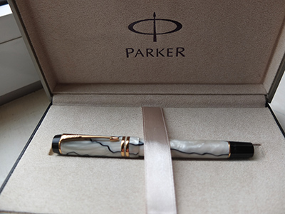 Here we have a very nice condition, almost mint, Parker International fountain pen in black and pearl marbled finish and boxed too; the fountain pen is a cartridge or converter-fill, with a converter fitted, and a medium grade 18ct gold nib; this pen has not been used much so is in such super condition; there are no cracks, splits or scratches and the clip is firm; the pen is boxed and I would think it was the original.
