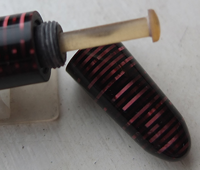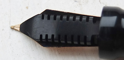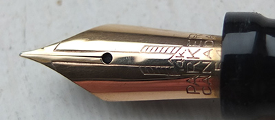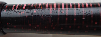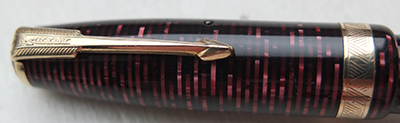 A beautiful condition Major-size Vacumatic fountain pen in burgundy pearl that has a plastic pump; there is no plating wear on the band or on the clip. There are no cracks or splits and virtually no scratches either; the tassie on the cap is black. The pen has been stripped, cleaned, had a new diaphragm fitted, reassembled, adjusted, and write tested. The nib is an extra-fine grade single-colour 14ct gold, and I would think, original to the pen; it writes nicely with slight flexibility. The imprint is very readable.