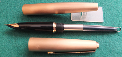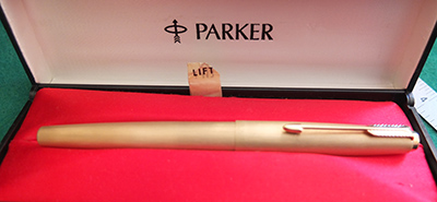 This is a mint uninked 65 Cirrus fountain pen with gold-filled trim; it is in beautiful condition and boxed too; it doesn't have the usual 'smile' where the end of the clip marks the cap; the nib is a medium grade 14ct gold and writes nicely. The pen is boxed and probably the original.
