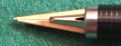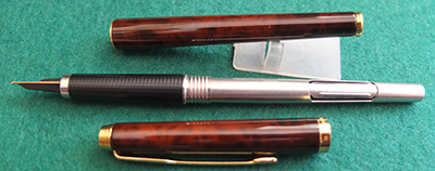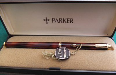 Here we have an uninked but unused Parker 180 cartridge or converter-fill fountain pen in Thuya finish with gold-filled trim; the pen has a nib which used on one side is fine and on the other side is broad; the pen has NOT been used apart from being inked and tried so obviously is in such lovely condition; there are no cracks, splits or serious scratches and the clip is firm.