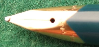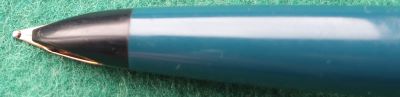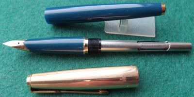 This is a very lightly used almost immaculate 65 fountain pen in blue with gold-filled trim; it is in super condition; the nib is a medium grade 14ct gold and writes nicely. There are no dings in the cap, no distortion in the nib shell, and no scratches.