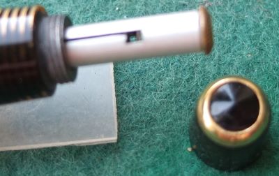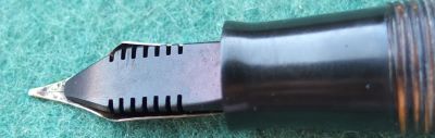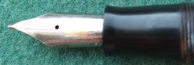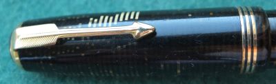 A very nice condition oversize Vacumatic fountain pen in golden pearl that has an aluminium lock-away filler; there is a little plating wear on the bands and just a little on the high points of the tassie ring and the clip. There are no cracks or splits and virtually no scratches either; the blind cap tassie is black but the clip tassie is golden striped. The pen has been stripped, cleaned, had a new diaphragm fitted, reassembled, adjusted, and write tested. The nib is a fine grade two-colour 14ct gold, and I would think, original to the pen; it writes nicely. The imprint is mostly unreadable.