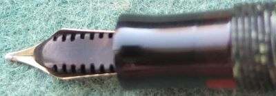 Here is a very nice Canadian Televisor in green and black from 1935 ish with gold trim and a readable imprint; this pen has been used so has a few small marks consistent with that use but it is not damaged and any new owner, wanting it to use, will be thrilled with it; it has a lovely medium grade 14ct gold Newhaven nib and writes nicely; there are slight signs of plating wear on the bands but not on the clip; there are very little signs of wear where the cap fits or where it is posted. Please note this is the smaller version.