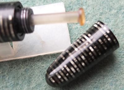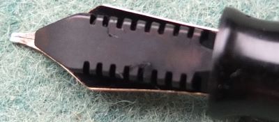 A very nice condition blue diamond Major-size Vacumatic fountain pen in silver pearl that has a plastic filler and nickel-plated trim; there is no plating wear on the band, or the clip. There are no cracks or splits and virtually no scratches either; the clip tassie is black. The pen has been stripped, cleaned, had a new diaphragm fitted, reassembled, adjusted, and write tested. The nib is a broad grade single-colour 14ct gold, and I would think, original to the pen; it writes nicely. The imprint is very readable and better than it looks in the picture.