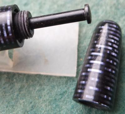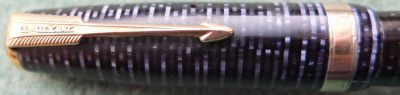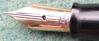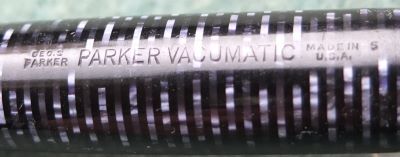 A very nice condition Major-size Vacumatic fountain pen in azure blue pearl that has a plastic filler and gold-plated trim; there is no plating wear on the band, or the clip. There are no cracks or splits and virtually no scratches either; the clip tassie is black. The pen has been stripped, cleaned, had a new diaphragm fitted, reassembled, adjusted, and write tested. The nib is a fine grade single-colour 14ct gold, and I would think, original to the pen; it writes nicely. The imprint is very readable and better than it looks in the picture.