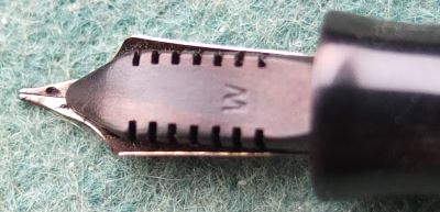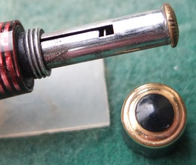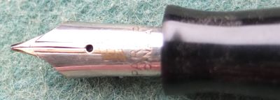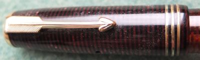 A very nice condition Major-size Vacumatic fountain pen in burgundy pearl that has a steel lock-away filler and gold-plated trim; there is little or no plating wear on the bands, the tassie ring, or the clip. There are no cracks or splits and virtually no scratches either; the blind cap tassie is burgundy stripey and the clip tassie is black. The pen has been stripped, cleaned, had a new diaphragm fitted, reassembled, adjusted, and write tested. The nib is a fine grade single-colour 14ct gold, and I would think, original to the pen; it writes nicely. The imprint is very readable and better than it looks in the picture. Please note this imprint has 'Reg Tm, Other Patents Pending' which I feel is unusual.