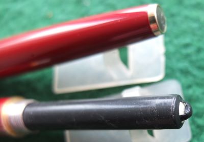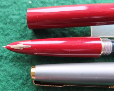 This is a mint unused uninked 61 fountain pen and liquid lead pencil set in rouge red with lustaloy caps and gold-filled clips; both items are in beautiful condition with the pen and pencil having never been used; the nib in the fountain pen is an extra-fine grade 14ct gold and will write nicely; the LL pencil has run out of ink and replacements are not available. The pen set is in its original box with the original leaflet which states that this is a First Edition set. This set should not be used but added to a smart collection. The original price for this set was $30.00, $22.50 for the pen and $7.50 for the pencil as shown on the corner label.