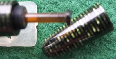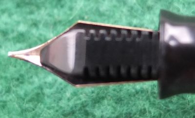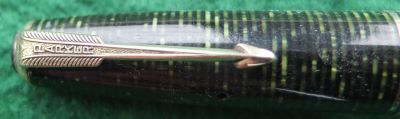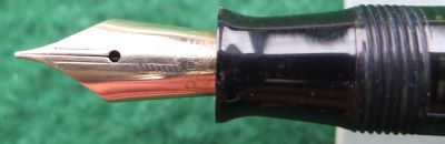 A very nice condition junior-size Vacumatic fountain pen in emerald pearl that has a plastic filler and gold-plated trim; there is no plating wear on the clip but there is a little on the bands. There are no cracks or splits and virtually no scratches either; the clip tassie is black. The pen has been stripped, cleaned, had a new diaphragm fitted, reassembled, adjusted, and write tested. The nib is a fine grade single-colour 14ct gold, and I would think, original to the pen; it writes nicely. The imprint is very readable. Please note that what looks like a scratch in the last picture is in fact a reflection of something.
