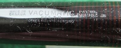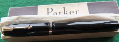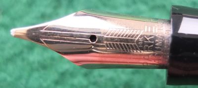 A superb condition oversize Vacumatic fountain pen in black that has an aluminium lock-away filler; there is no plating wear on the bands and just a little on the high points of the tassie ring and the clip. There are no cracks or splits and virtually no scratches either; the blind cap tassie and the clip tassie is black. The pen has been stripped, cleaned, had a new diaphragm fitted, reassembled, adjusted, and write tested. The nib is a broad grade single-colour 14ct gold, and I would think, original to the pen; it writes beautifully. The imprint is very readable.