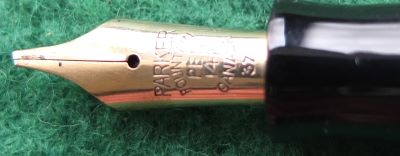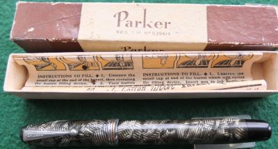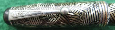 Here is a very nice Canadian Televisor in silver and black from 1935 ish with nickel trim and an unreadable imprint; this pen has been used so has a few small marks consistent with that use but it is not damaged and any new owner, wanting it to use, will be thrilled with it; it has a lovely broad oblique grade 14ct gold Canadian nib and writes nicely; there are slight signs of plating wear on the bands but not on the clip; there are very little signs of wear where the cap fits or where it is posted. Please note this is the larger version.