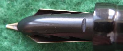 Here is a very nice Duofold Senior Lucky Curve fountain pen in black permanite from 1928 ish with a very crisp imprint; this pen has been used so has a few small marks consistent with that use but it is not damaged and any new owner, wanting it to use, will be thrilled with it; it has a lovely fine grade 14ct gold nib and writes nicely; the pen has obviously been well looked after, albeit used, but there are no signs of plating wear on the bands or the clip; there are very slight signs of wear where the cap fits but not where it is posted. Please note that despite what the picture seems to show there are no cracks or blemishes on the nib.