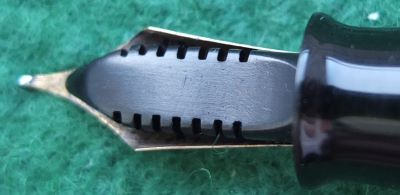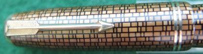 A beautiful condition Golden Web Vacumatic fountain pen that has an aluminium lock-away filler; there is no plating wear on the bands or the tassie ring but there is a little 'spotting' on the clip. There are no cracks or splits and virtually no scratches either; the blind cap and the clip tassies are both black. The pen has been stripped, cleaned, had a new diaphragm fitted, reassembled, adjusted, and write tested. The nib is a fine grade single-colour 14ct gold, and I would think, original to the pen; it writes nicely with just a little flexibility. The imprint is barely readable.