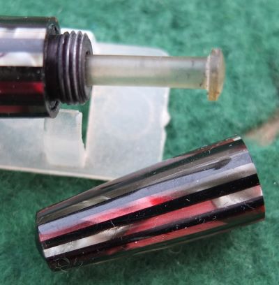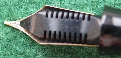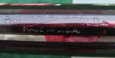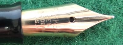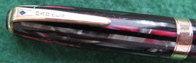 A very nice condition Duovac fountain pen in red, silver and black with gold-plated trim; the pen has a vacumatic style plastic pump; there is virtually no plating wear on the band or the clip. There are no cracks or splits and virtually no scratches either. The pen has been stripped, cleaned, had a new diaphragm fitted, reassembled, adjusted, and write tested. The nib is a fine grade 14ct gold, and I would think, original to the pen; it writes nicely. The imprint is readable.