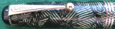 Here is a very nice Canadian Televisor in green and black from 1935 ish with gold plated trim and a very readable imprint; this pen has been used so has a few small marks consistent with that use but it is not damaged and any new owner, wanting it to use, will be thrilled with it; it has a lovely medium grade 14ct gold Canadian nib and writes nicely; there are slight signs of plating wear on the bands but not on the clip; there are very little signs of wear where the cap fits or where it is posted. Please note this is the larger version. Please note the marks on the top of the blind cap are dust.