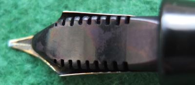 Here is a very nice Duofold Senior Streamline fountain pen in black from 1930 ish with a readable imprint; this pen has been used so has a few small marks consistent with that use but it is not damaged and any new owner, wanting it to use, will be thrilled with it; it has a lovely medium grade 14ct gold nib and writes nicely; the pen has obviously been well looked after, albeit used, but there are slight signs of plating wear on the clip and the bands; there are slight signs of wear where the cap fits and where it is posted.