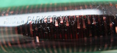 A very nice condition Maxima Vacumatic fountain pen in burgundy pearl that has an aluminium speedline filler and gold-plated trim; there is virtually no plating wear on the band, the tassie ring, or the clip. There are no cracks or splits and virtually no scratches either; the blind cap tassie is butgundy striped whilst the clip tassie is black. The pen has been stripped, cleaned, had a new diaphragm fitted, reassembled, adjusted, and write tested. The nib is a fabulous medium grade two-colour 14ct gold, and I would think, original to the pen; it writes like a dream. The imprint is mostly readable. Please note the picture of the back of the nib makes it look broader than it is.