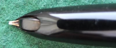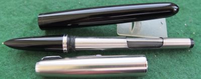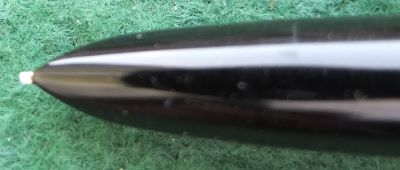 A very nice condition but used 51 fountain pen in black with a lustaloy cap; this pen is good and the cap is good too; there are no bruises on the cap; the pen does have the most lovely medium-oblique grade 14ct gold nib. This pen is a very good daily-use item but is good enough to add to a collection.