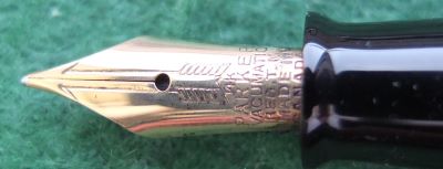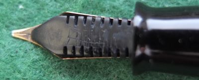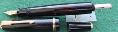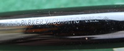 A very nice condition Junior Vacumatic fountain pen in black that has an aluminium speedline filler and gold-plated trim; there is virtually no plating wear on the bands, the tassie ring, or the clip. There are no cracks or splits and virtually no scratches either; the blind cap tassie and the clip tassie are black. The pen has been stripped, cleaned, had a new diaphragm fitted, reassembled, adjusted, and write tested. The nib is a very nice medium grade single-colour 14ct gold, and I would think, original to the pen; it writes like a dream. The imprint is mostly readable. The barrel is partially see-through.