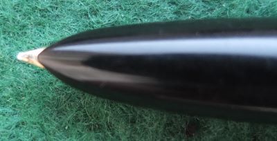 A very nice condition but used 51 vacumatic fountain pen in black with a gold-filled cap; this pen is good and the cap is good too apart from quite a few tiny bruises; the pen does have the most lovely fine grade 14ct gold nib. This pen is a very good daily-use item but is not good enough to add to a collection, in my view.