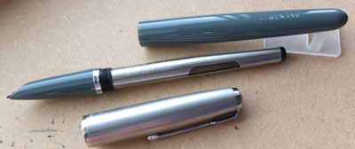 Here we have a lightly used Parker 51 fountain pen and ballpen set in grey with lustaloy caps; the pen has a medium grade 14ct gold nib and is an aerometric filler; neither the pen nor the ballpen have been used very much as the condition is so good; the fountain pen still has chalk marks on the barrel and the ink sac is see-through; there are no cracks, splits or serious scratches and the clips are firm; there is no name or initials on the pens.