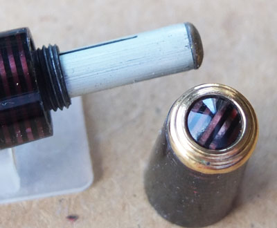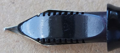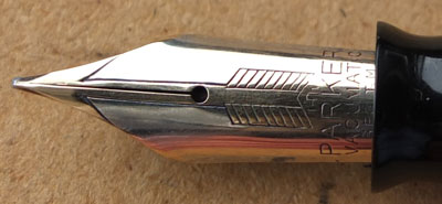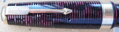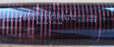 A nice condition Canada-made Maxima Vacumatic fountain pen in burgundy pearl that has an aluminium speedline filler; there is little or no plating wear on the bands or the tassie ring but there is some on the high points of the clip. There are no cracks, splits, or engraved names and the tassies on the cap and blind capn are burgundy pearl striped; there are one or two small marks consistent with use. The pen has been stripped, cleaned, had a new diaphragm fitted, reassembled, adjusted, and write tested. The nib is a fine grade two-colour 14ct gold, and I would think, original to the pen; it writes nicely. The imprint is very readable.