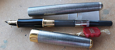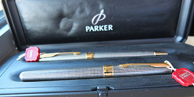 Here we have a mint uninked immaculate-condition French-made Parker Sonnet fountain pen and ballpen set in cisele finish with gold-filled trim; the fountain pen is a cartridge or converter-fill pen and has a converter fitted; the pen has a medium grade 18ct gold nib; the set has not been used so is in immaculate condition still having the shop seals attached and boxed too; there are no cracks, splits or scratches and the clips are firm. Please note the second picture shows what looks like marks on the section but one is a hair and the other is the way the light shines on it.
