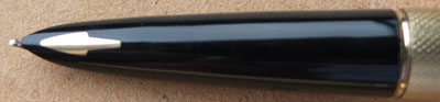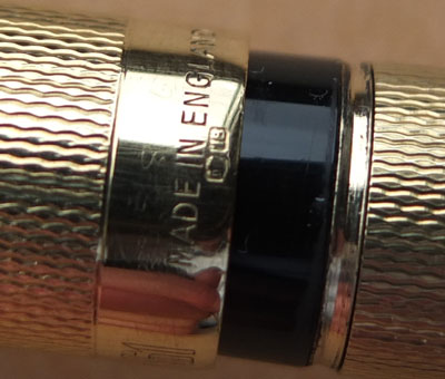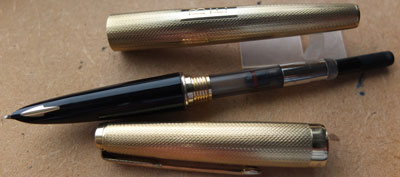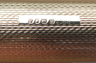 Here we have an immaculate-condition Parker 61 fountain pen in 18ct gold with an 18ct gold hall-marked clip from the mid 1970s; one can see that it has not been handled very much from the condition; there is however, the initials 'BE' on the cartouche but no dings or scratches; the pen uses cartridges or a converter which is in fact fitted; the nib is a medium grade and writes nicely. The hallmark shows an 'h' for 1975/76, I think.