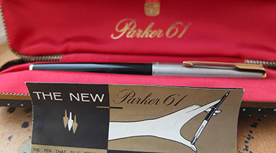 par1274: A very nice condition unused Parker 61/65 ballpoint pen in gold-filled finish; the pen still has the original shop label; boxed too £55.00 SOLD |