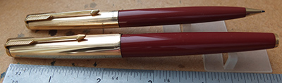 par1027: A 61 fountain pen and pencil set in rouge red with gold-filled caps; this set has been used but is in lovely condition and will last for years; the pen is a cartridge or converter-fill and has a converter fitted; the pen has a medium grade 14ct gold nib and writes nicely. £125.00 SOLD |