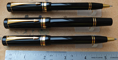 par1087: A Parker International fountain pen, ballpen, and pencil set in black with gold-filled trim; it has not been used much so is in lovely condition; the pen has a medium grade 18ct gold nib and writes nicely £280.00 SOLD |