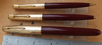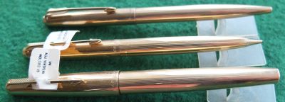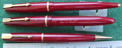 par1094: A very nice 51 aerometric fountain pen, ballpen, and pencil set in burgundy with gold-filled caps; the fountain pen has a medium grade 14ct gold nib; this is a lovely example of a desireable pen set. £185.00 |